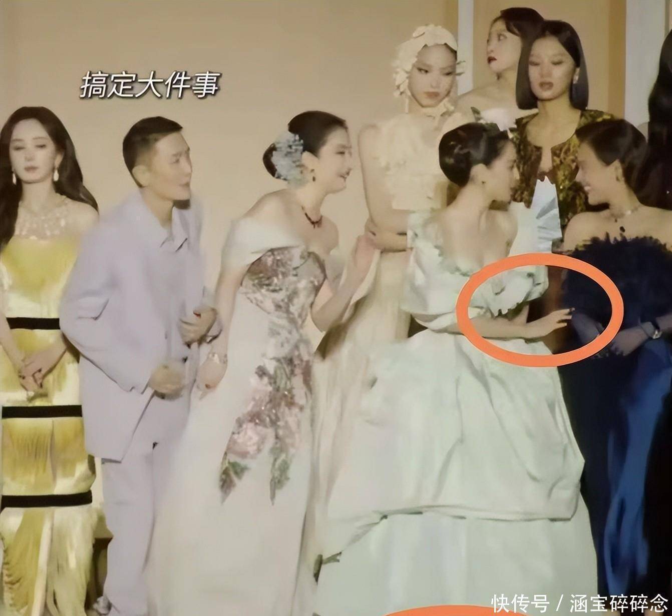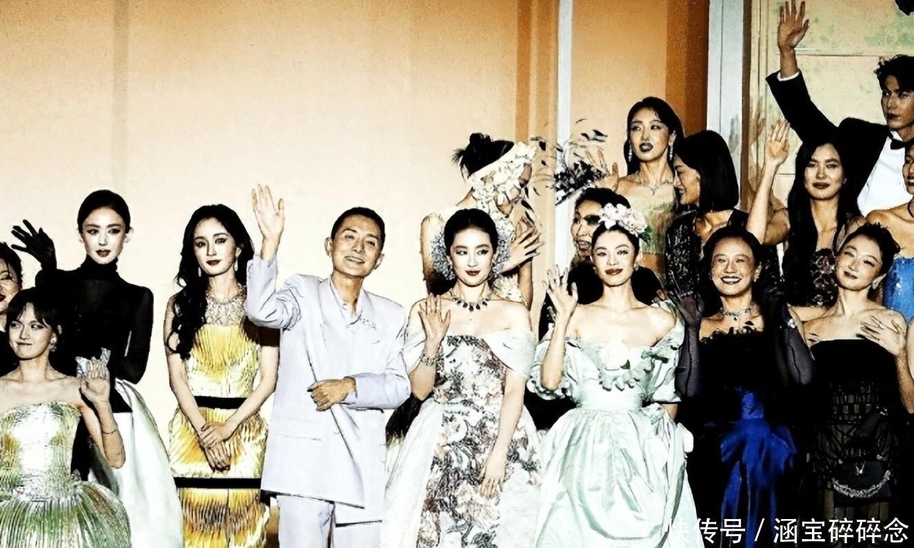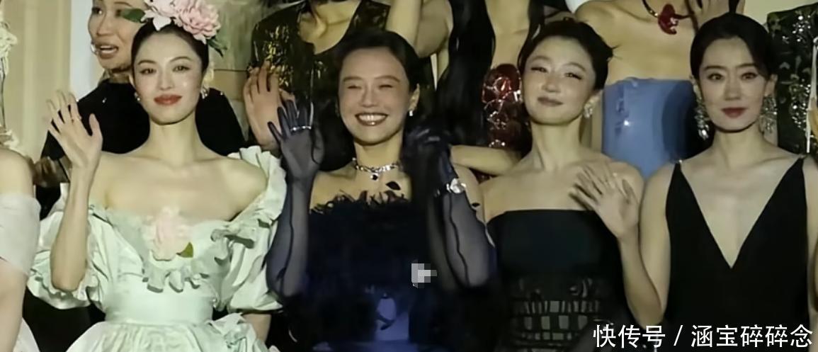 可看看当天的合影,无论是左边还是右边,都是咖位要比她大的不止一点点的明星们,她直接让三位影后,加上当晚一个压轴一个开场,两个顶流当了配角。