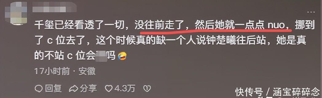就算和身边的马思纯聊天,看似好像往旁边去了一些,结果把腿部的细节放大,发现钟楚曦有一只腿始终在C位上,宁愿大劈叉也丝毫不挪动。